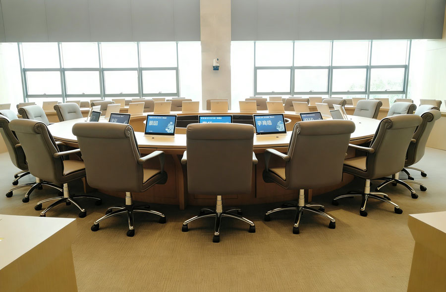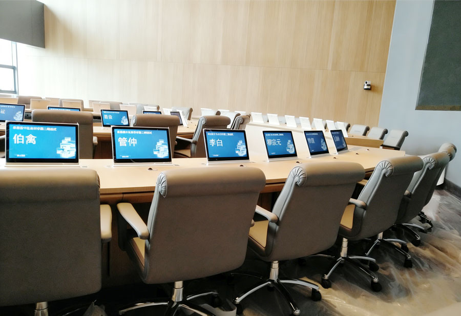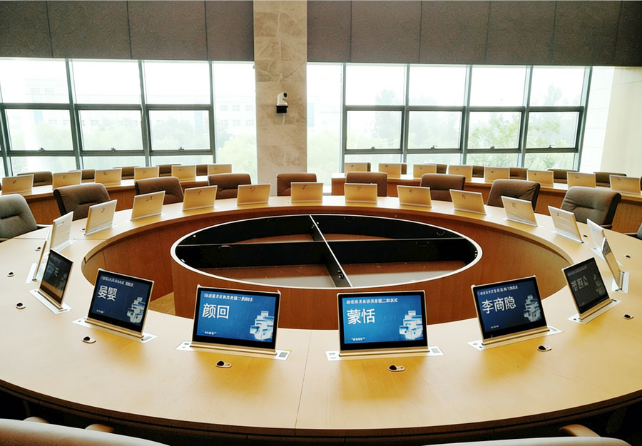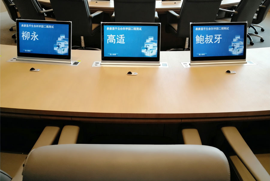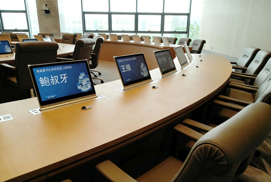 会场配置电容升降屏,集成高清触控显示与电子桌牌功能,支持一键升降与灵活触控操作,未使用时可隐藏收纳,保持桌面整洁,兼顾使用便捷性与空间美观度。