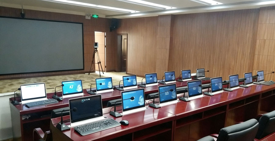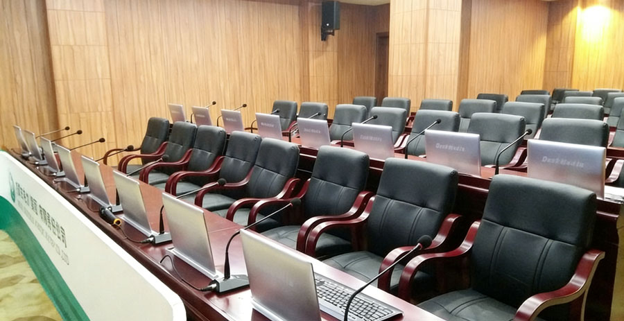 - 配置超薄一体式无纸化会议终端,集成高清触控屏、电子铭牌、双向交互、话筒联动功能,外观简洁、布局规整,适配会议室标准化建设。