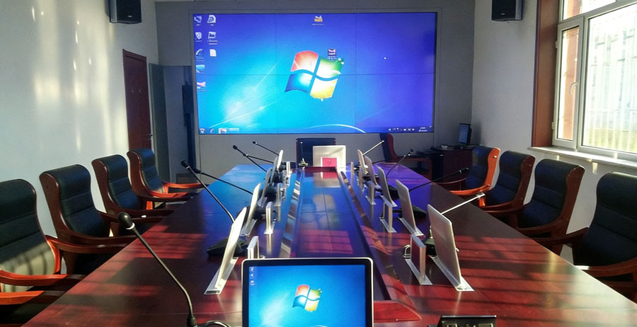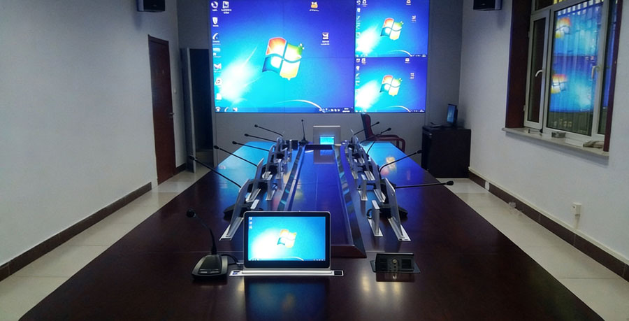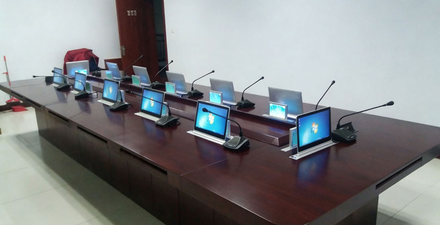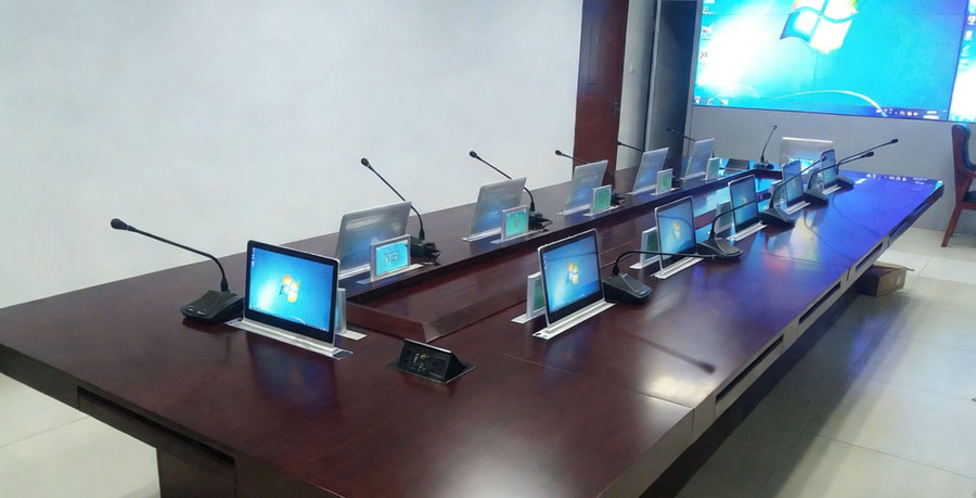 - 部署超薄一体式升降会议终端,集成高清触控屏、鹅颈会议话筒、电子铭牌,完美适配小型会议桌布局,桌面整洁美观。