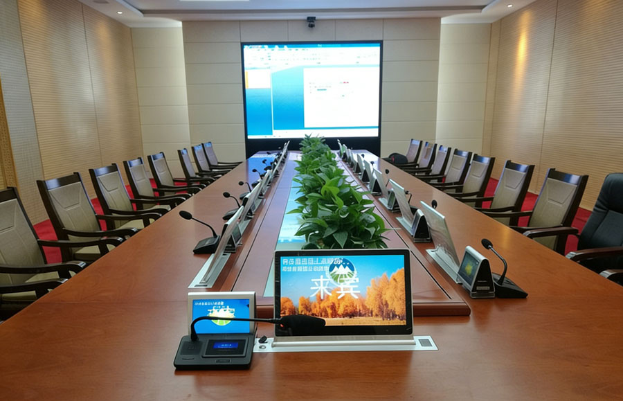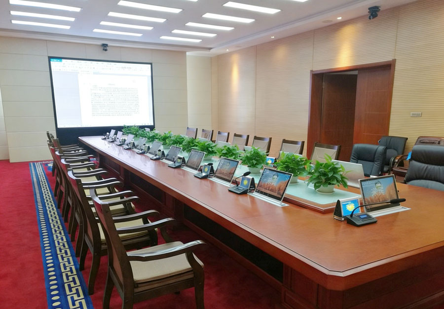 - 硬件配置:部署高清超薄一体式无纸化会议终端,集成话筒、电子铭牌、触控屏等功能,适配中型会议桌规整布局,兼顾美观与实用;搭配投影显示系统,满足会议内容同步投屏、共享需求。